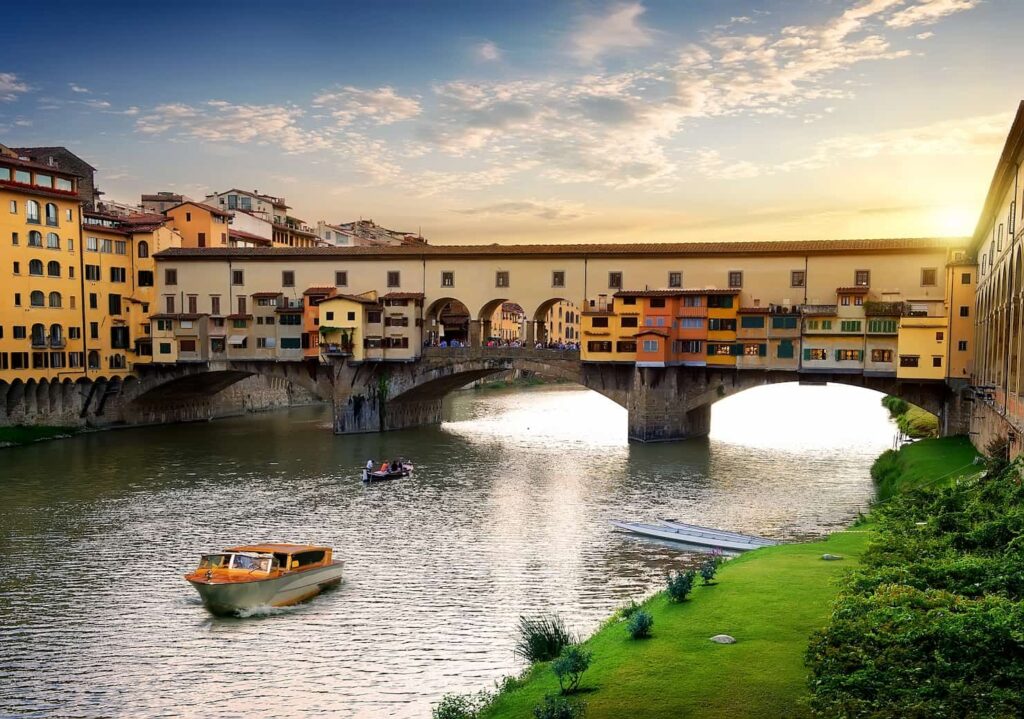 Costruito nel XIV secolo, ospitava in origine botteghe di macellai e conciatori, sostituiti oggi da orafi e negozi di lusso. Scavalca il fiume Arno e, a metà della sua lunghezza, grazie al belvedere con il busto di Benvenuto Cellini, regala uno dei panorami più suggestivi e romantici della città.